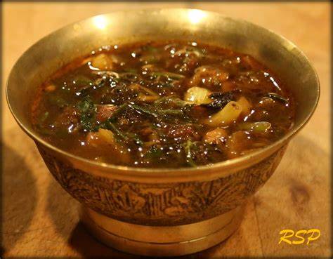 Gundruk jhol is a hearty soup made from fermented lentil leaves. It is a popular dish in the Himalayan region and is said to have medicinal properties. The leaves are fermented for several weeks, which gives the soup a unique flavor and texture. Gundruk jhol is typically served with rice or roti.